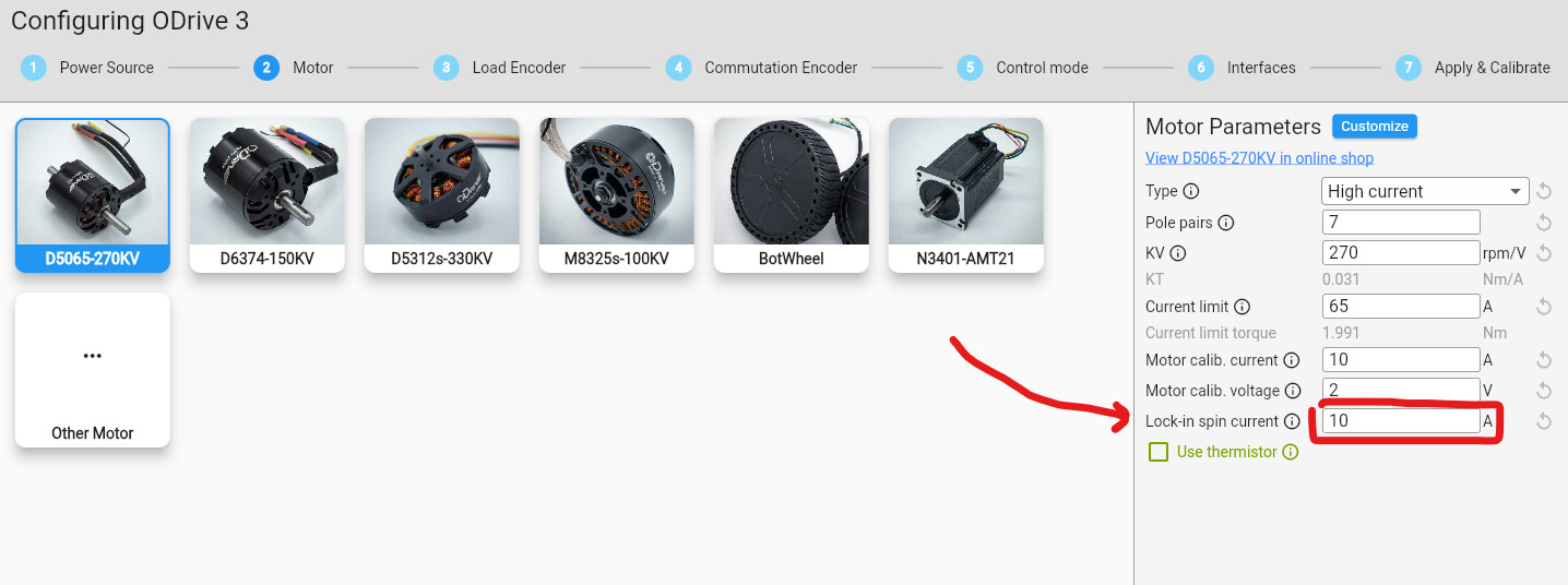 - Seems like you’re using the D5065 270KV from our shop, but your calibration_lockin.current is really low – you should bump this to around the motor’s max continuous current (about 40-45A) for more accurate calibration