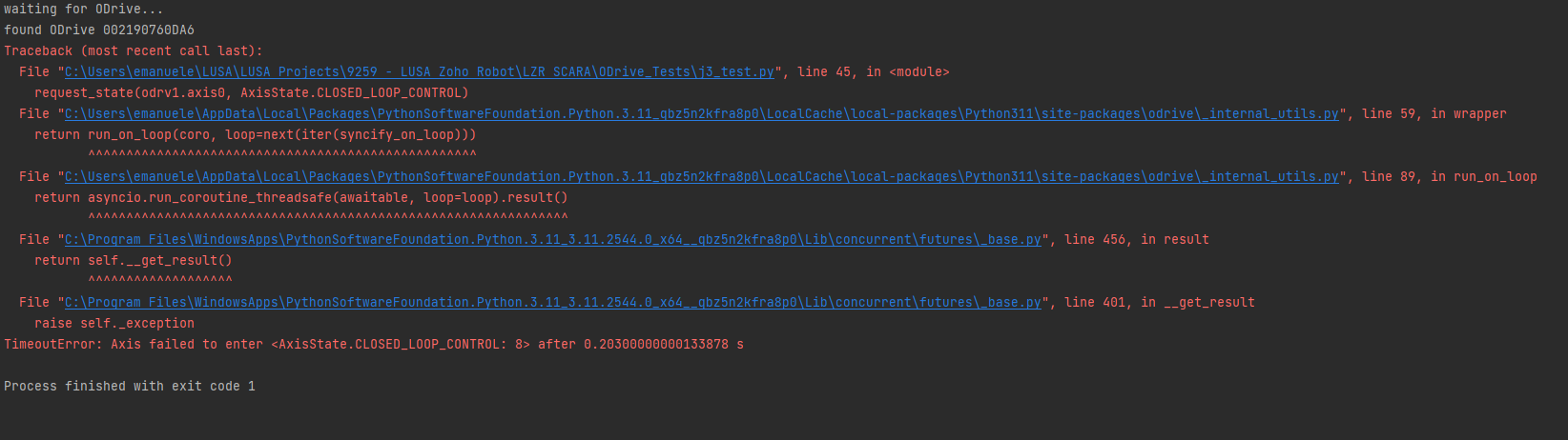 Exception: Axis failed to enter <AxisState.CLOSED_LOOP_CONTROL: 8>: axis0