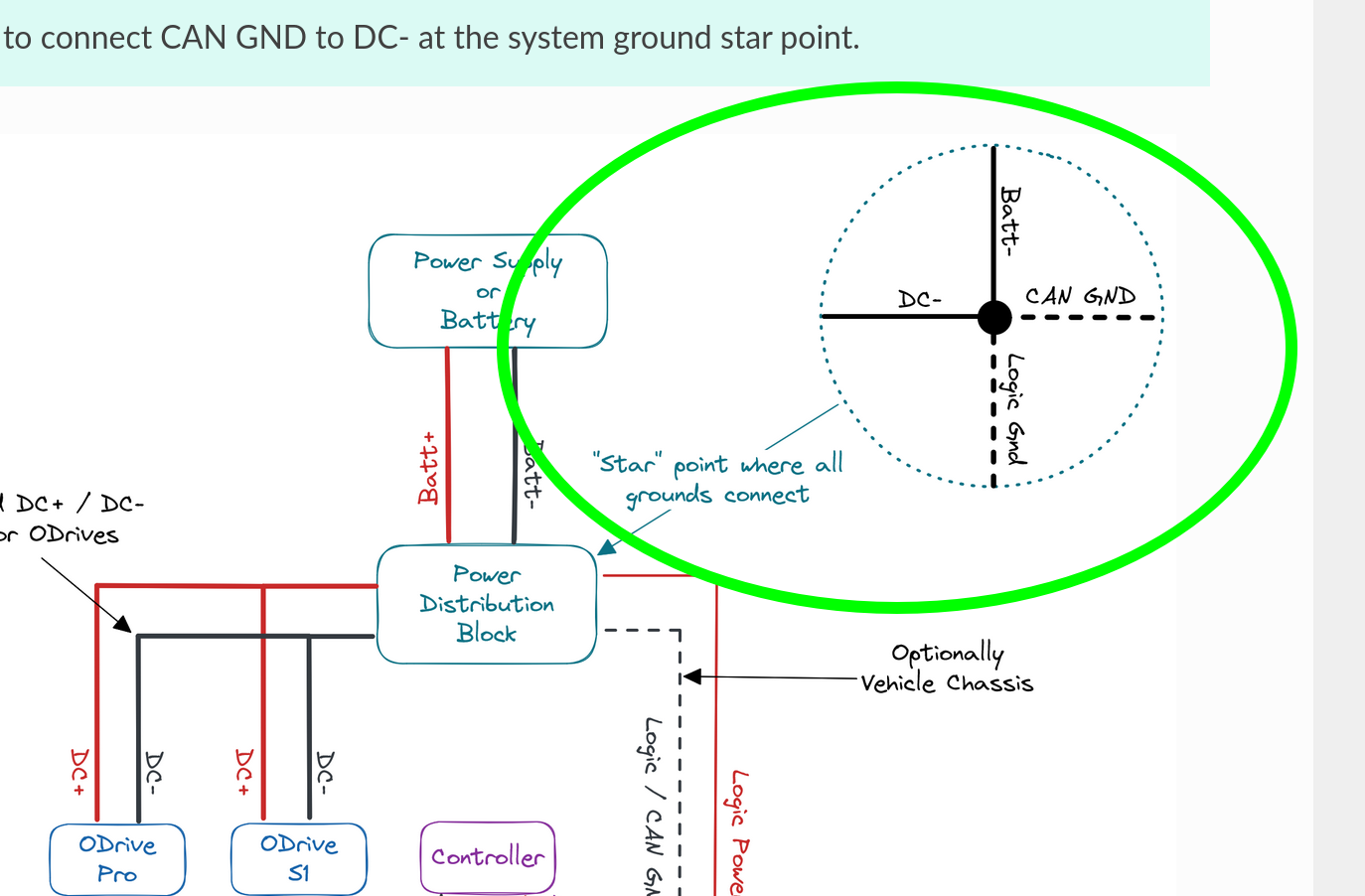 Hi! On the ODrive Micro and S1, CAN is referenced to the ODrive’s DC-, and the CAN connectors are just used for a convenient daisy-chain (the CAN GND is internally not connected, only passed between the connectors). On the ODrive Pro, CAN is referenced to CAN_GND (which must be connected to the system DC- at some point). Typically, you want to star logic and power grounds at a single location. In the Arduino docs, the passthrough CAN_GND is used as an easy way to get the Arduino on the same ground domain as the S1 – another option would be to just run a wire from Arduino GND to the S1 DC-, or preferably to do so near your power supply / battery / power distribution block. Note that it does show to connect grounds in the CAN bus guide: