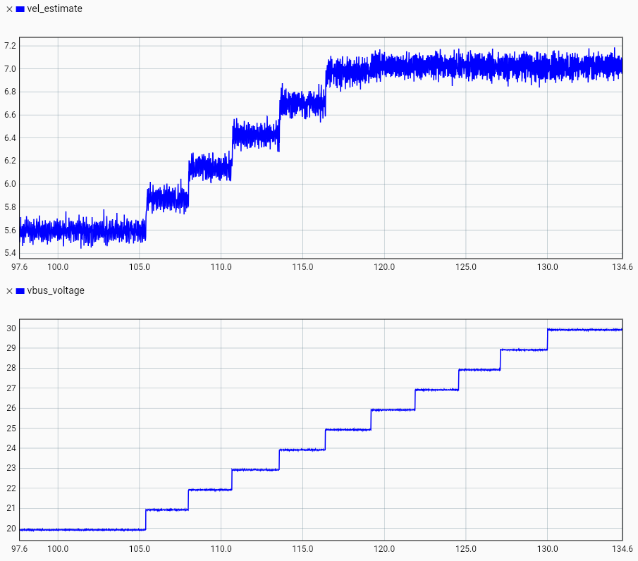 The problem I encounter is that the ODrive seems to actively limit the velocity for a reason I do not understand. I expect it to be able to spin at k_v * v_dc * 0.78. The motor is rated at 24 rpm/V, so with 24 V it should reach 450 rpm, and at 30 V up to 560 rpm. However, the velocity saturates at around 420 rpm at 25 V and doesn’t increase further with increasing supply voltage. Setting the target velocity to 15 rps and slowly increasing the voltage from 20 V to 30 V yields the following behavior: