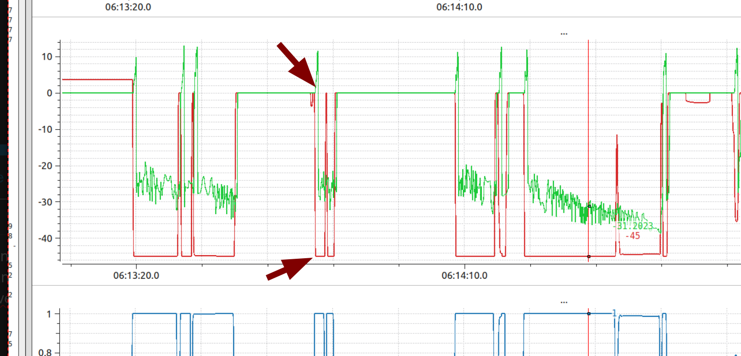 As seen in the attached screenshot, when we send certain command inputs to the controller, we observe that the feedback signal reports some nonzero value, even though the motor shaft itself is not moving. At the same time, we also notice a spike in bus current.