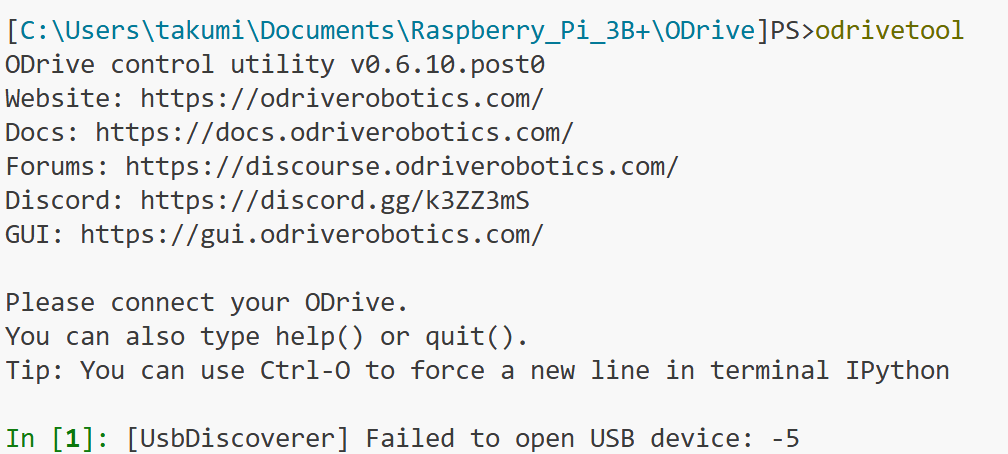 I am trying to control a motor with odrivetool, but the ODrive Micro does not seem to be recognized correctly. I receive the following error: