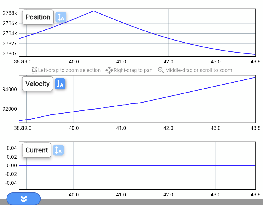 - Velocity estimate continues to climb as shown even after the odrive has errored out and the motor is not spinning. Sometimes when I unplug the odrive to reset the values, it’ll actually still think the velocity is increasing after I’ve plugged it back into my laptop.